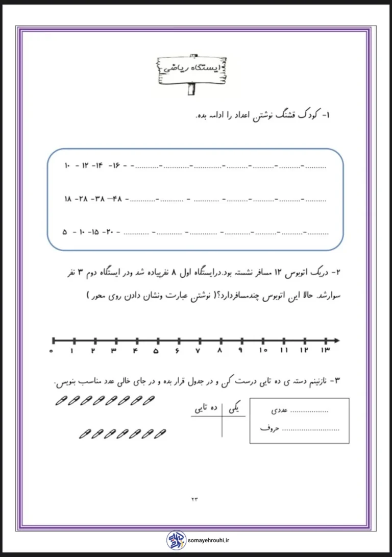 * **پاسخ:** از وسایل کمک آموزشی مثل مکعب ها یا ماشین های کوچک استفاده کنید. ۱۳ ماشین (نماینده مسافر) را ردیف کنید و سپس ۸ تا را بردارید تا مفهوم “کم شدن” یا “تفریق” را به طور عینی ببیند.
