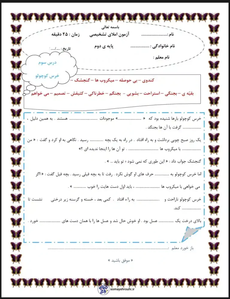 | این آزمون مربوط به کدام پایه است؟ | پایه دوم ابتدایی، درس سوم فارسی (“خرس کوچولو”). |