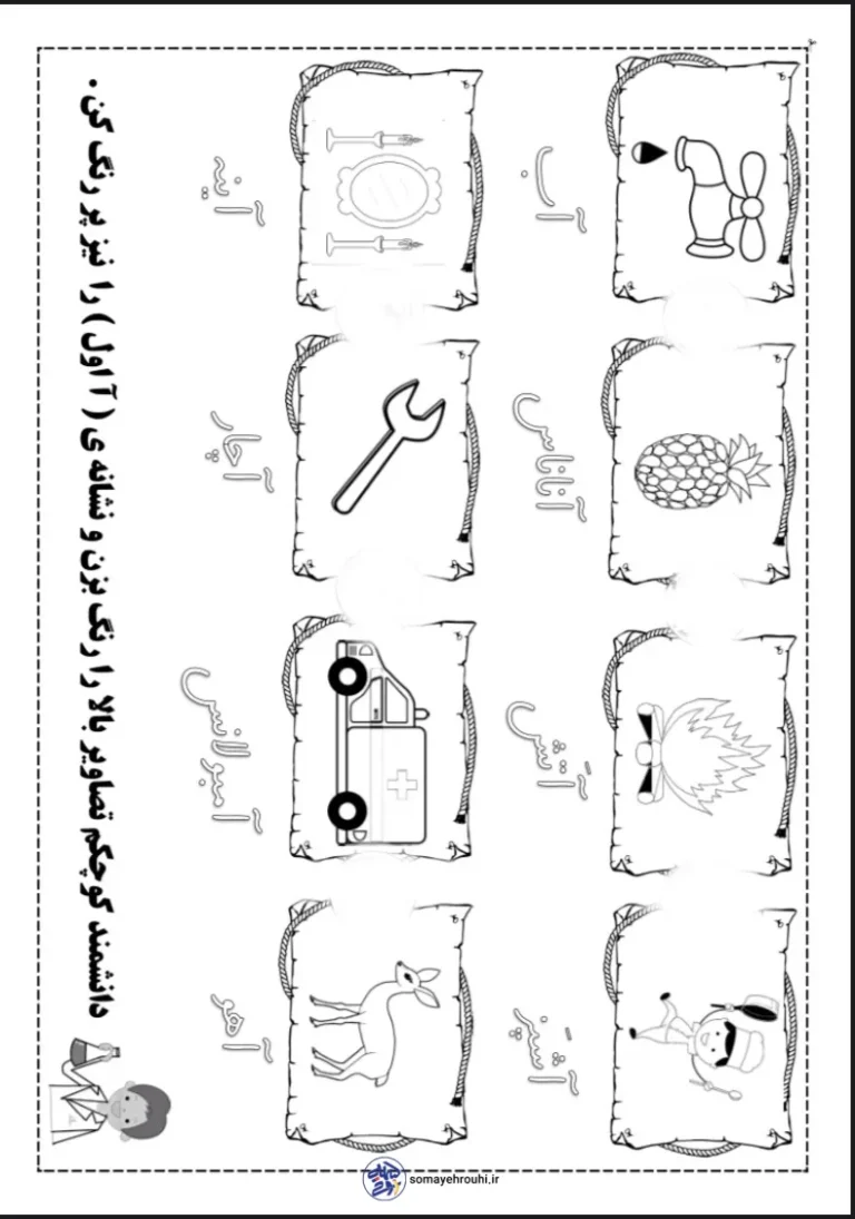| چگونه میتوانم از این برگه بهترین استفاده را ببرم؟ | ابتدا از کودک بخواهید نام تصاویر را بگوید و اگر با “آ” شروع میشوند، دایرهای دورشان بکشد و سپس شروع به رنگآمیزی کند. |