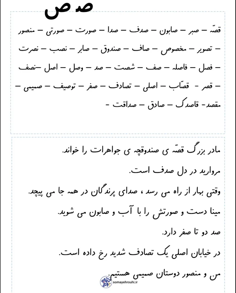این آزمون املا نشانه ص اول دبستان یکی از مهمترین مهارتهای نوشتاری است که دانشآموزان را به درک دقیق و نوشتن درست حرف ص و کلمات مرتبط با آن میآموزد. هدف اصلی این آزمون، تقویت توانایی دانشآموزان در تشخیص، نوشتن و استفاده از کلمات حاوی نشانه ص (مثل صورت، صبح، صدف، صد) در متن است. این آزمون همچنین به دانشآموزان کمک میکند تا تفاوت بین حروف مشابه (مانند ص و س) را درک کنند و از اشتباهات نوشتاری جلوگیری کنند.