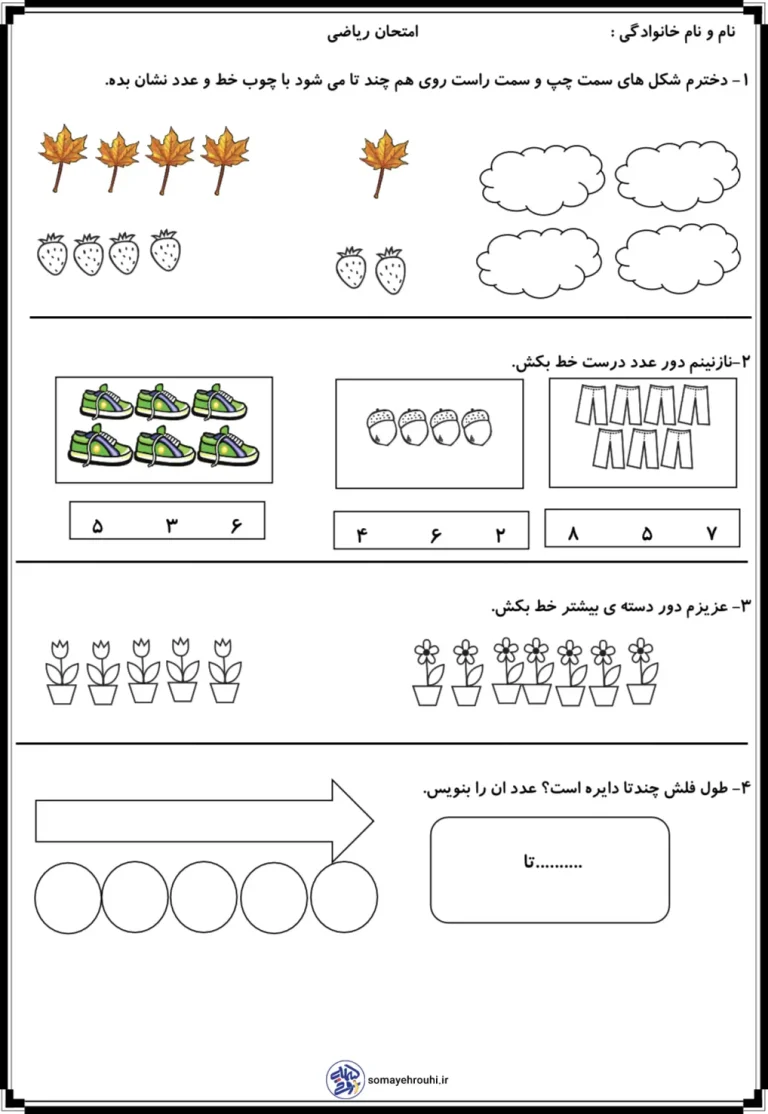 تشخیص و مقایسه عدد: دور عدد درست خط بکش و مفهوم کمتر و بیشتر را مشخص کن.
