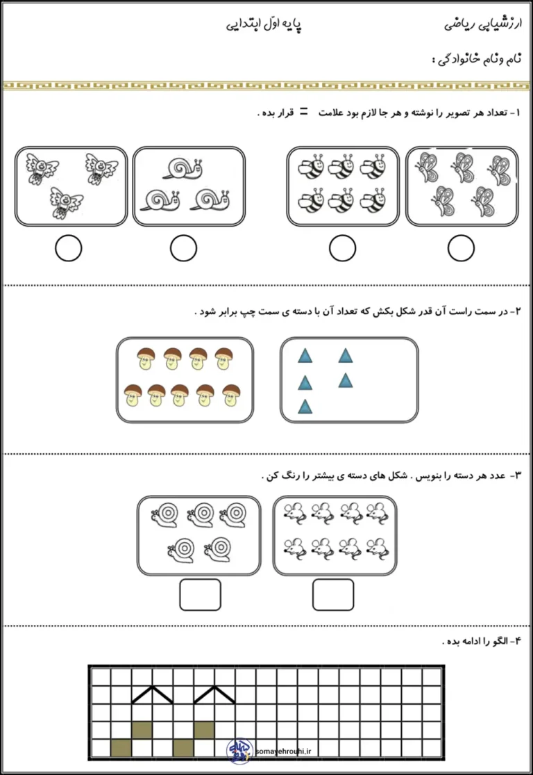 سنجش عینی: سؤالاتی مانند “تعداد هر تصویر را نوشته و هر جا لازم بود علامت > یا < قرار بده” و “شکلهای هر دو دسته با هم چند تا میشود؟ با عدد و چوب خط نشان بده” توانایی دانشآموز در ارتباط دادن عدد با کمیت و استفاده از ابزار چوب خط را میسنجد.