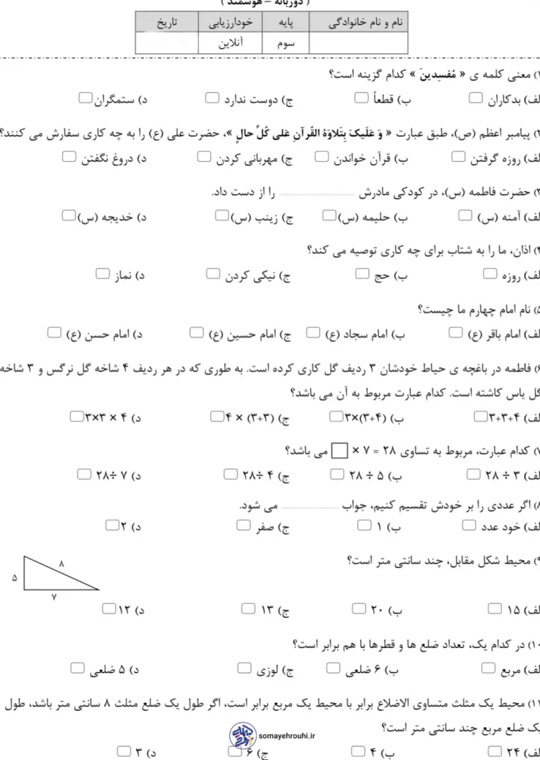 تنوع سوالات: شامل سوالات محاسباتی (ضرب و محیط)، درک مطلب (شعر و واژگان)، علمی (ماشینهای ساده و بازیافت) و دینی.