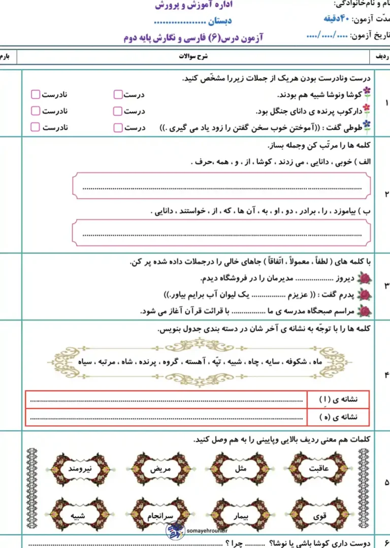 این آزمون درس شش فارسی پایه دوم دبستان، تمام مفاهیم کلیدی این درس را با عنوان «کوشا و نوشا» را پوشش میدهد. دانشآموزان در این ارزشیابی با چالشهای متنوعی از جمله درک متن داستان، مرتبسازی جملات پریشان و جایگذاری قیدهای زمان و حالت روبرو میشوند. طراحی سوالات به گونهای است که علاوه بر سنجش سطح یادگیری، مهارتهای نوشتاری و تحلیل زبانی کودک را نیز تقویت میکند.