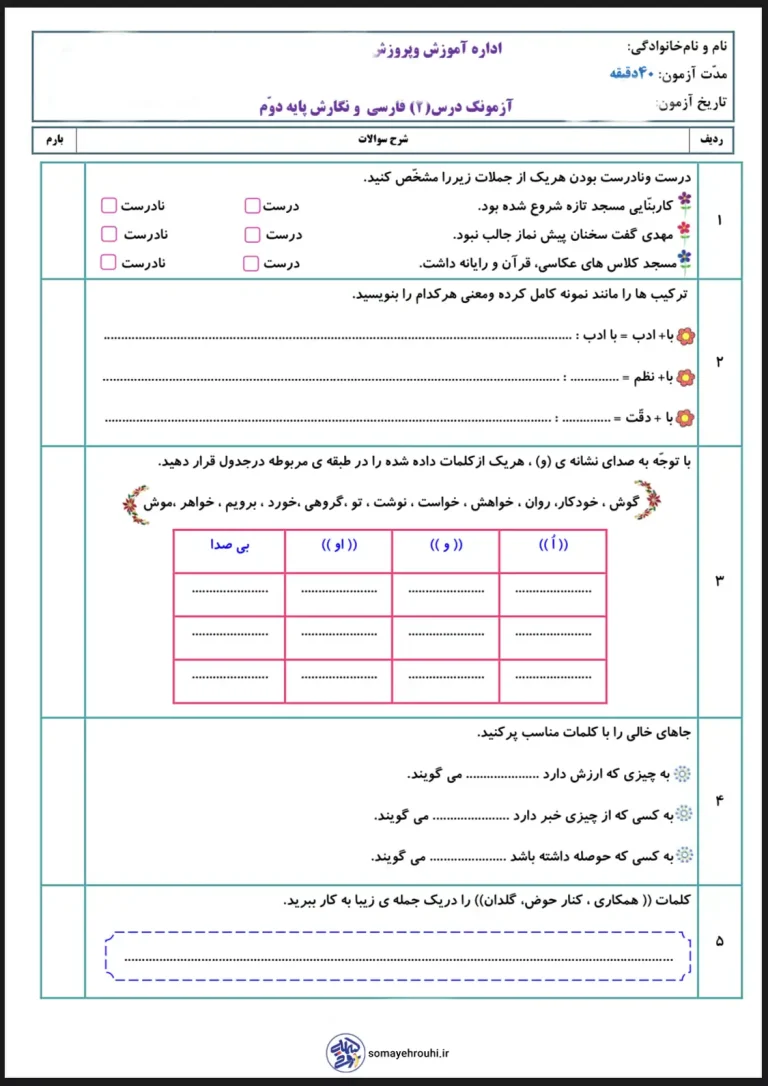 دانشآموزان عزیز پایه دوم، در این ماه، با هدف تقویت مهارتهای زبانی و آشنایی با نهادهای اجتماعی مهم مانند مسجد، ارزشیابی درس دوم فارسی (مسجد محلهی ما) را پشت سر میگذارند. این آزمون درس ۲ فارسی پایه دوم دبستان با جواب فرصتی است تا میزان درک شما از مفاهیم درس، بهویژه نقش مسجد در جامعه، و همچنین تواناییهای شما در واژهسازی، جملهسازی، و خواندن با درک مطلب بهصورت توصیفی ارزیابی شود. هدف اصلی ما این است که یادگیری شما عمیق، پایدار و لذتبخش باشد.