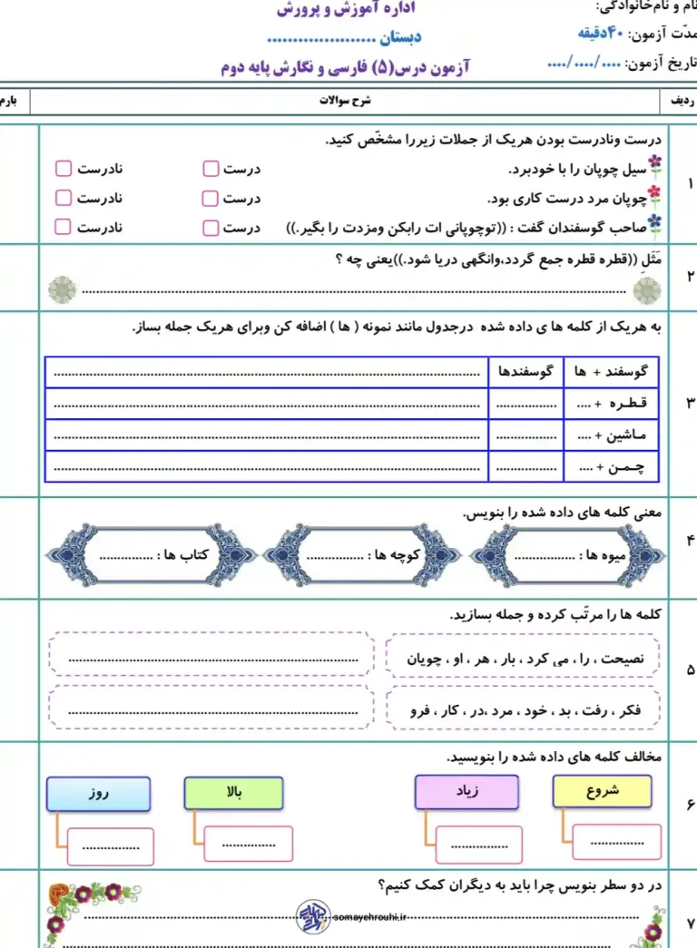 آزمون درس ۵ فارسی نگارش پایه دوم دبستان