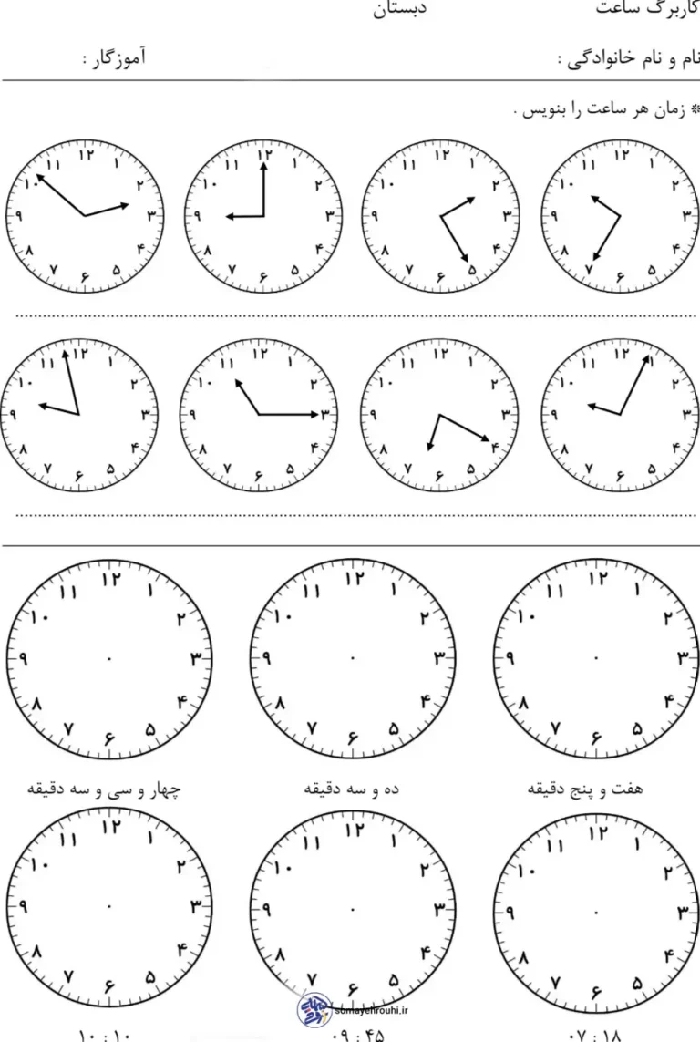 این آزمون رایگان ساعت دوم دبستان طراحی شده تا میزان یادگیری آنها از خواندن ساعتهای مختلف (ساعت کامل، نیمساعت، ربع و دقیقههای ساده) بهصورت دقیق و استاندارد سنجیده شود. این آزمون با الگوگیری از تمرینهای کتاب درسی و متناسب با سطح درک دانشآموزان پایه دوم تهیه شده و فرصتی عالی برای تمرین، تثبیت و آمادگی قبل از امتحانات کلاسی است.
