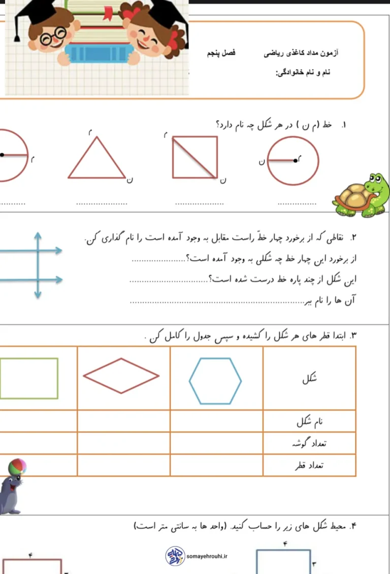 آزمون ریاضی فصل ۵ پایه سوم دبستان با هدف سنجش دقیق یادگیری دانشآموزان از مباحث «محیط و مساحت» طراحی شده و میتواند بهعنوان یک ارزیابی استاندارد در کلاس، آزمون پایانی فصل یا تمرین جمعبندی در منزل مورد استفاده قرار گیرد. سؤالات این آزمون متناسب با سطح کتاب درسی بوده و با طراحی جذاب و کودکپسند، باعث کاهش استرس دانشآموز و افزایش تمرکز او در هنگام پاسخگویی میشود. تنوع سؤالات کمک میکند تا معلم یا والدین، درک واقعی دانشآموز از مفاهیم را بهخوبی بررسی کنند.