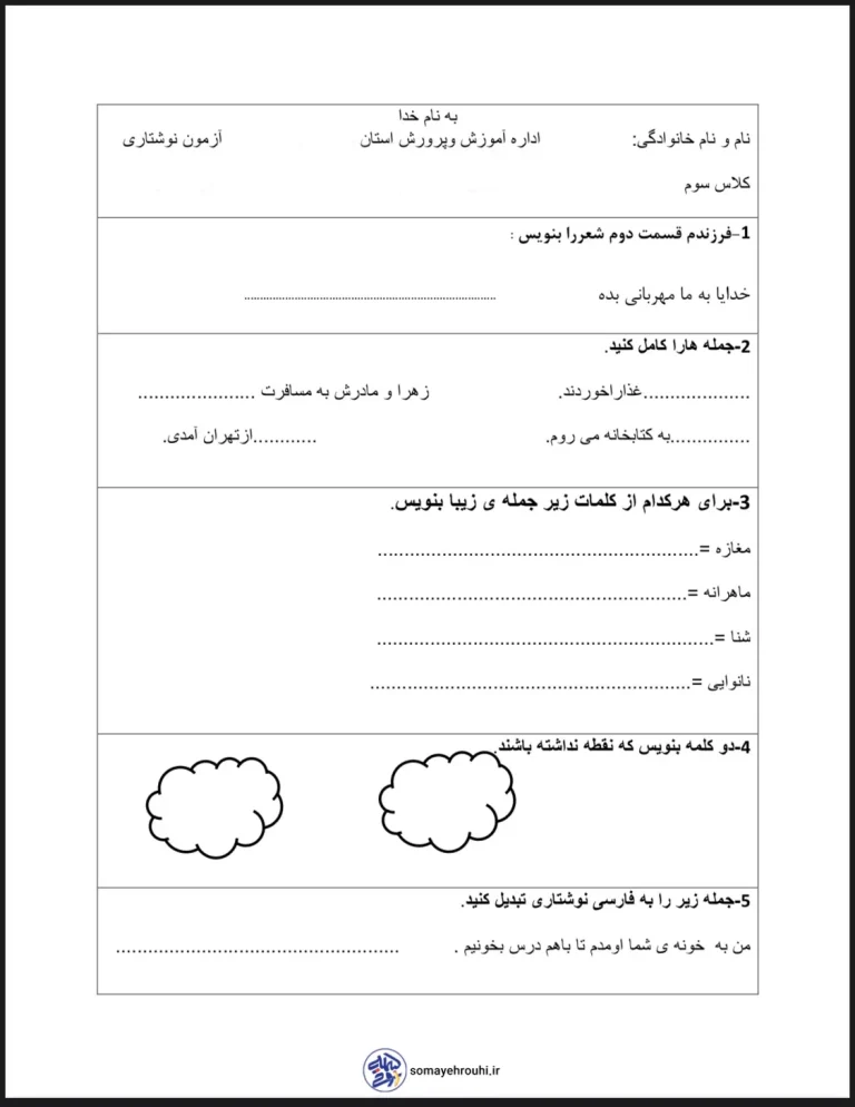 این آزمون نوشتاری کلاس سوم، ابزاری جامع برای سنجش دانشآموزان در زمینههای کلیدی مانند تکمیل شعر و جمله، کاربرد کلمات، تبدیل گفتار به نوشتار و توانایی جمله سازی است. با پاسخ به این سوالات، دانشآموزان فرصت مییابند تا آموختههای خود را به کار گیرند و معلم نیز میتواند نقاط قوت و ضعف آنها را به صورت دقیق ارزیابی کند. آمادگی برای این آزمون، گامی مهم در تقویت پایههای سواد نوشتاری فرزندان دلبند شماست.