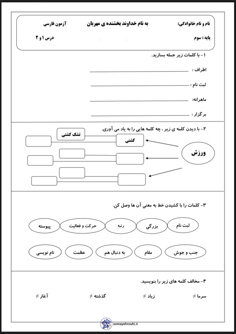 آزمون فارسی درس ۱ و ۲ پایه سوم دبستان