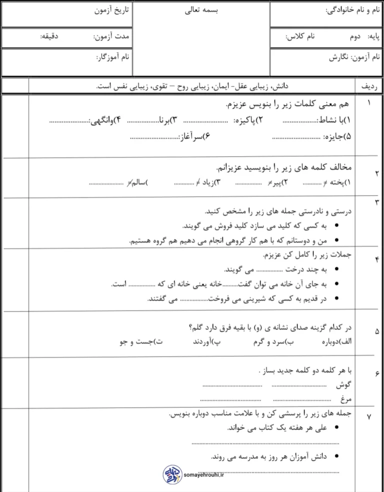 این آزمون فارسی نوبت اول کلاس دوم دبستان برای ارزیابی پیشرفت تحصیلی دانشآموزان پایه دوم در درس فارسی (نگارش) طراحی شده است. ساختار سوالات به گونهای است که علاوه بر جنبههای علمی، با لحنی عاطفی و تشویقکننده (مانند استفاده از واژگان “عزیزم” و “گلم”) فضای مثبتی را برای دانشآموز ایجاد میکند. آزمون شامل بخشهای متنوعی از جمله واژگان، دستور زبان، نگارش و درک مشاغل است.