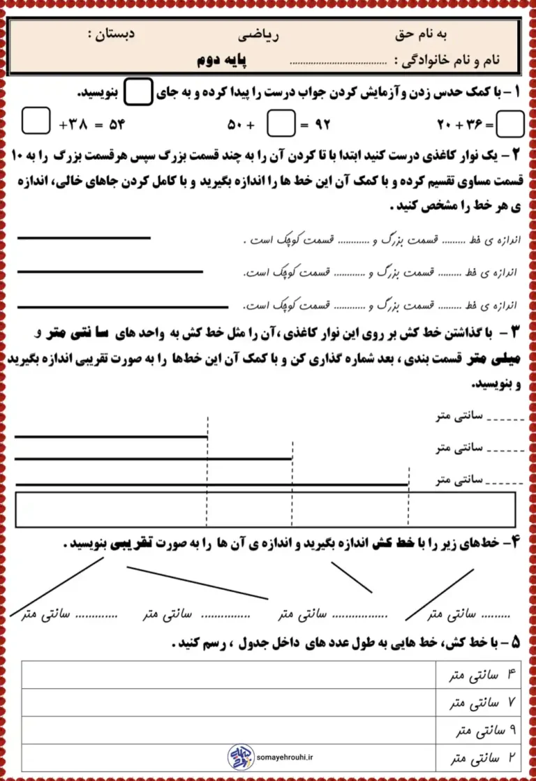 نکته جالب این آزمون این است که فقط به اندازهگیری محدود نمیشود. در سوال اول، دانشآموز با استراتژی “حدس و آزمایش” روبرو میشود که پایهی تفکر منطقی در حل مسئله است. این یعنی ما فقط به دنبال یاد دادن “چند سانتیمتر است؟” نیستیم، بلکه میخواهیم ذهن کودک را برای پیدا کردن روابط بین اعداد آماده کنیم. وقتی کودک یاد میگیرد که ۳۸ به علاوه چه عددی میشود ۵۴، در واقع دارد فاصله بین اعداد را در ذهن خود “اندازهگیری” میکند که مقدمهای عالی برای درک فاصله فیزیکی روی خطکش است.