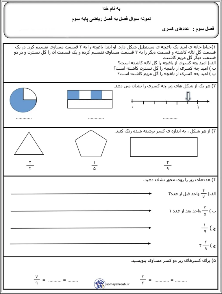 آزمون فصل عدد های کسری پایه سوم دبستان
