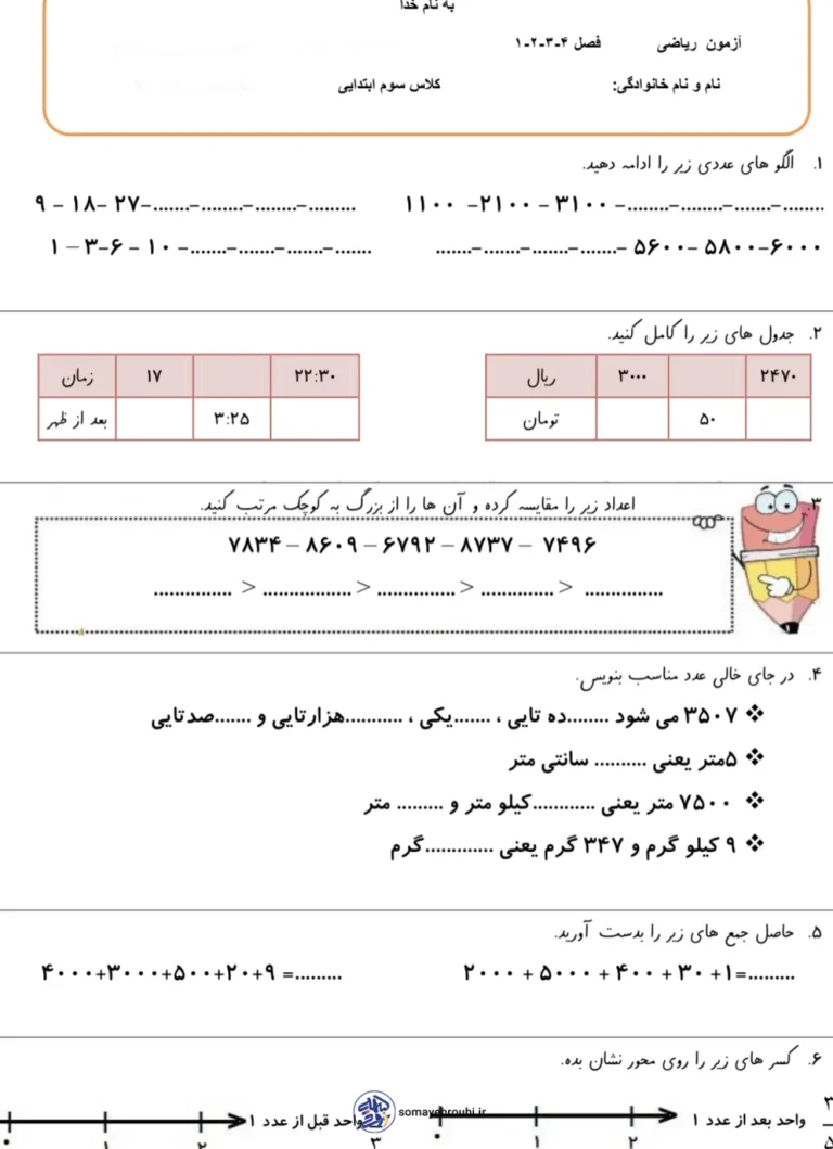 این آزمون فصل ۱ تا ۴ ریاضی سوم دبستان یک مجموعهی جامع و استاندارد برای سنجش یادگیری دانشآموزان در مباحث مهم نیمسال اول است. این آزمون با پوشش کامل مفاهیمی مانند الگوهای عددی، مقایسه و مرتبسازی اعداد، جدولها، جمع و تفریق، ارزش مکانی، اندازهگیری و کسرها طراحی شده و به معلمان و والدین کمک میکند تا میزان تسلط دانشآموزان را بهصورت دقیق ارزیابی کنند. سطح سوالات متناسب با کتاب درسی و توان ذهنی دانشآموزان پایه سوم تنظیم شده است.