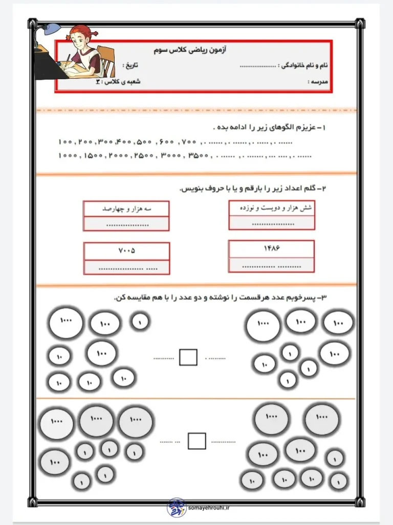 آزمون فصل ۲ ریاضی سوم دبستان