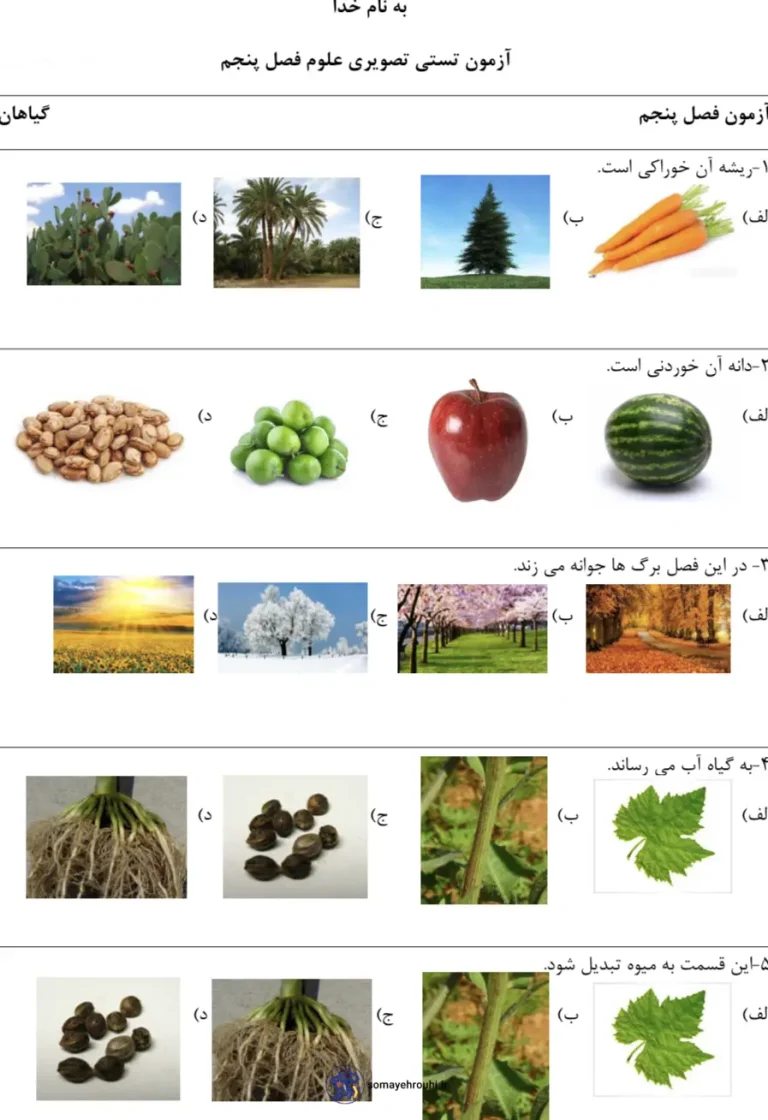 این آزمون فصل ۵ علوم کلاس اول دبستان که به صورت تصویری ارائه شده است، ابزاری برای ارزیابی میزان یادگیری دانشآموزان کلاس اول از فصل پنجم کتاب علوم، با تمرکز بر “دنیای گیاهان” است. این سوالات چندگزینهای، مفاهیم کلیدی فصل را به چالش میکشند. سوال ۱ و ۲ بر طبقهبندی گیاهان بر اساس خوراکی بودن (هویج، هندوانه، سیب) و غیرخوراکی بودن (کاکتوس، نخل، درخت کاج) تمرکز دارند. سوال ۳ دانشآموز را به درک ارتباط بین فصول و تغییرات گیاهان میبرد. در نهایت، سوال ۴ و ۵ اجزای مهم گیاه مانند ریشه (وظیفه آبرسانی) و برگ/گل (تبدیل به میوه) را میآزماید. این ساختار، یک نمای جامع از درک دانشآموز از زیستشناسی مقدماتی را فراهم میکند.