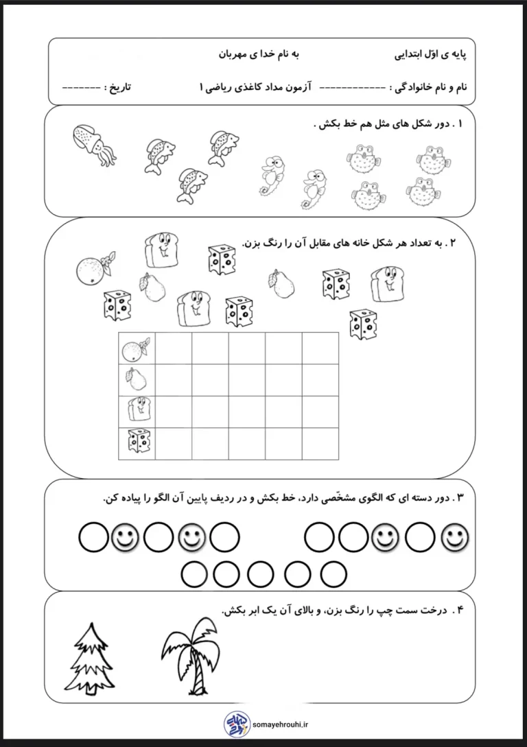 آزمون مدادکاغذی ریاضی فصل ۱ پایه اول دبستان