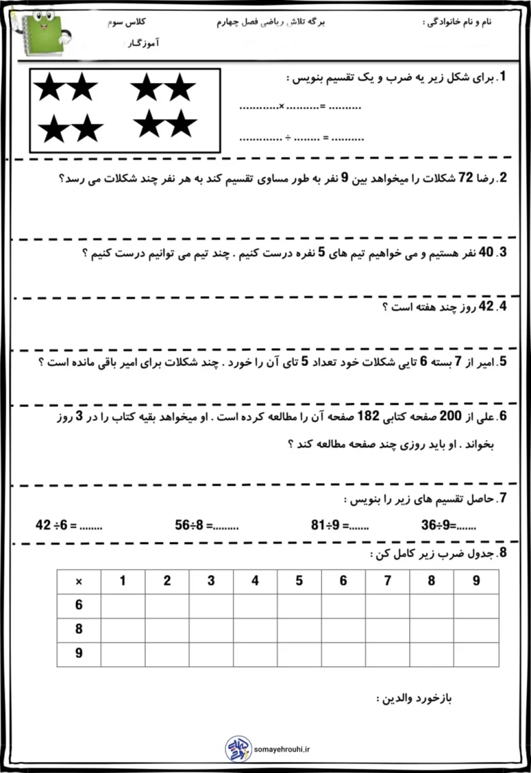 آزمون نوبت اول ریاضی پایه سوم دبستان