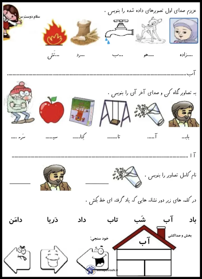 این آزمون شامل چهار بخش اصلی است که با استفاده از تصاویر رنگی و جذاب، دانشآموز را به چالش میکشد. در بخش اول، کودک باید صدای اول تصاویر (مانند آزاده، آهو، آب، آرد و آتش) را تشخیص دهد. در بخش دوم، تمرکز بر صدای آخر کلمات (مانند بابا، آب، تاب، کتاب، سیب و سرما) است. بخش سوم به نوشتن نام کامل تصاویر ساده اختصاص یافته و در نهایت، تمرین «بخش کردن و صداکشی» کلمات کلیدی مانند «آب» برای تثبیت یادگیری نشانهها طراحی شده است.