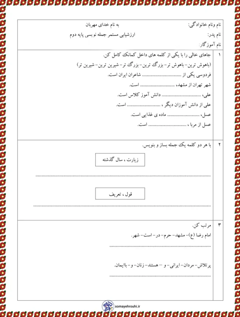 ارزشیابی جمله نویسی فارسی دوم دبستان