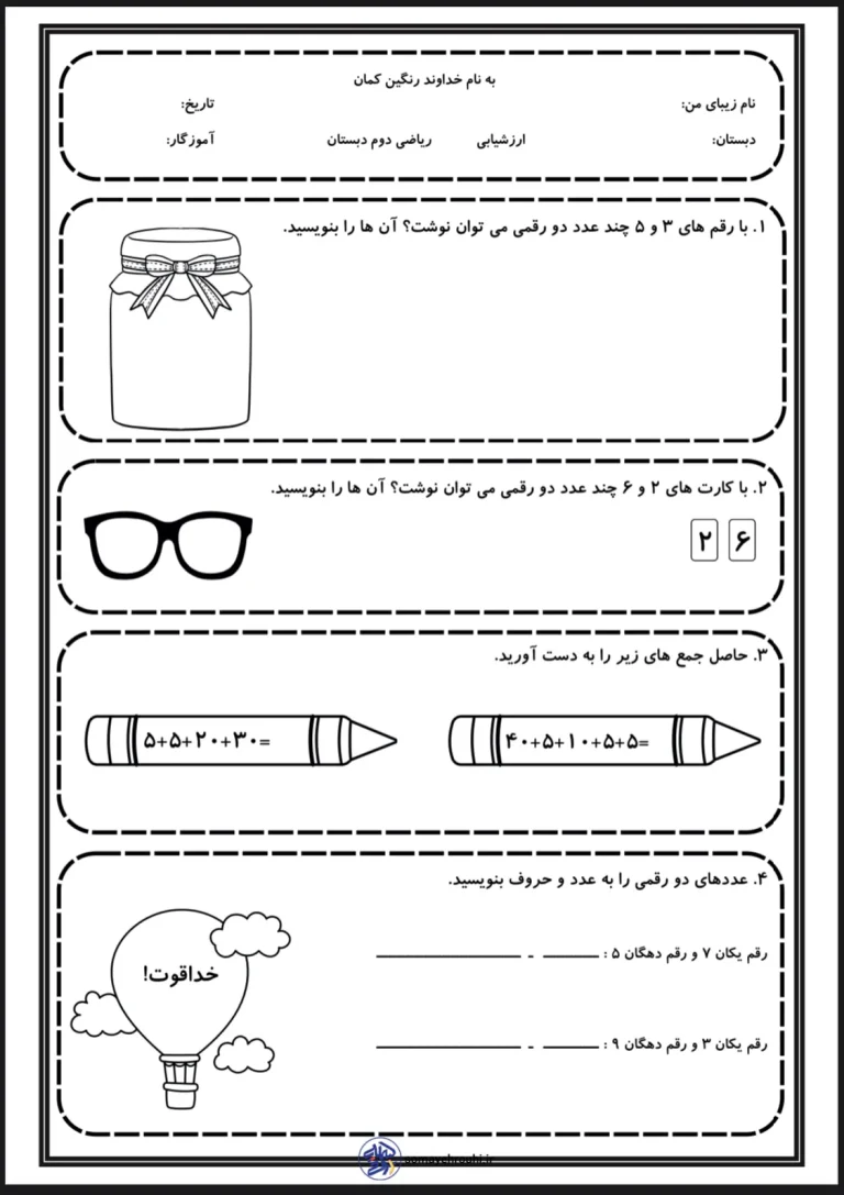 آمادهاید تا دنیای جذاب اعداد را کشف کنید؟ 🤩 این ارزشیابی ریاضی دوم دبستان | اعداد دو رقمی برای دانش آموزان باهوش شما طراحی شده است تا مفاهیم مهم ریاضی را به شیوهای سرگرمکننده و تصویری تمرین کنند! از ساختن اعداد دو رقمی با کارتهای بازی گرفته تا حل معماهای شیرین جمع، این کاربرگ یک تمرین کامل برای تسلط بر اعداد، الگوها و محاسبات ذهنی است. دیگر از تکالیف خستهکننده خبری نیست، با این کاربرگ یادگیری ریاضی به یک ماجراجویی هیجانانگیز تبدیل میشود!
