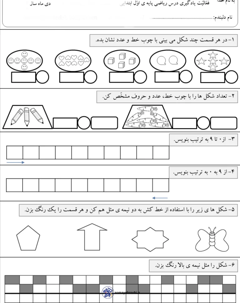 این ارزشیابی ریاضی دی ماه کلاس اول به منظور سنجش مهارتهای ریاضی اولیه دانشآموزان درنیمسال تحصیلی طراحی شده است. اهداف اصلی شامل تشخیص توانایی شمارش، تطبیق و مقایسه اشیاء، درک مفاهیم مربوط به مجموع و تفاضل، و توانایی تشخیص الگوهای شکلی و رنگی است. این آزمون با استفاده از مسائل بصری و کاربردی طراحی شده تا دانشآموزان بتوانند با استفاده از تجربیات روزمره، مفاهیم ریاضی را درک کنند.