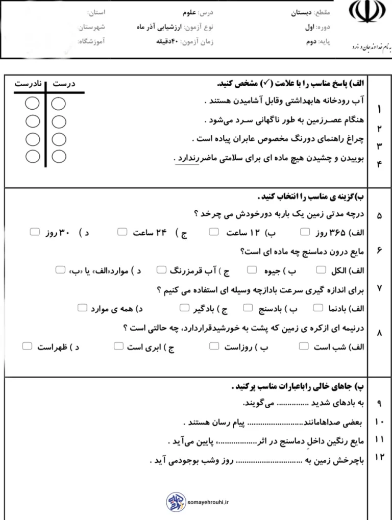 ارزشیابی علوم پایه دوم دبستان آذرماه