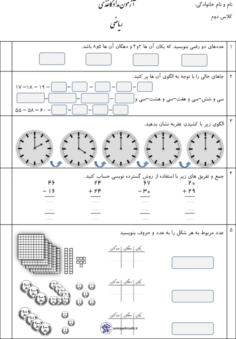 ارزشیابی نوبت اول ریاضی پایه دوم دبستان