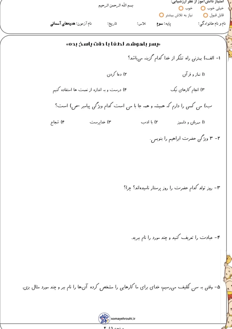 این ارزشیابی هدیه های آسمان پایه سوم نوبت اول یک نمونه استاندارد و کاربردی برای سنجش یادگیری دانشآموزان در نیمسال اول تحصیلی است که بر اساس محتوای کتاب هدیههای آسمان طراحی شده است. این ارزشیابی با بهرهگیری از انواع سؤالها مانند چندگزینهای، جایخالی و تشریحی، مفاهیم دینی و اخلاقی را به زبانی ساده و متناسب با سطح فکری دانشآموزان پایه سوم بررسی میکند. ساختار کودکپسند، استفاده از جملات آسان و فضای کافی برای پاسخنویسی، باعث میشود دانشآموز بدون استرس و با آرامش به سؤالات پاسخ دهد.