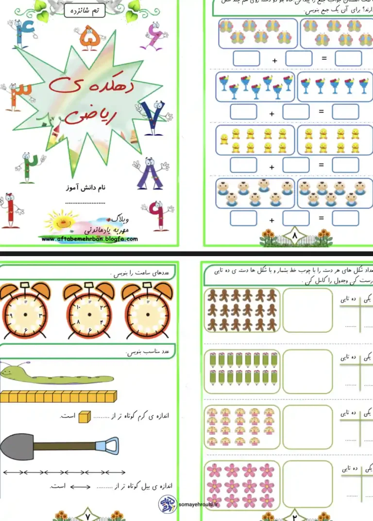 در تم ۱۶ ریاضی کلاس اول دبستان، دانشآموزان وارد مرحلهی جدید و هیجانانگیزی میشوند. اگر به صفحات نگاه کنید، میبینید که تمرکز اصلی این تم بر روی درک عمیقتر اعداد، جمعهای پیشرفتهتر و مفاهیم پایهای اندازهگیری و زمان است. در این تم، بچهها یاد میگیرند که چگونه دستههای اشیاء (مثل پروانهها، جوجهها و آدمبرفیها) را بشمارند و با مفهوم جدول ارزش مکانی (یکی و دهتایی) آشنا شوند. این تم پلی است بین شناخت اعداد یکرقمی و ورود به دنیای اعداد بزرگتر. تصویر جلد با عنوان “دهکدهی ریاضی” نویدبخش یک ماجراجویی جذاب برای کلاس اولیهاست تا ریاضی را نه به عنوان یک درس خشک، بلکه به عنوان یک بازی شیرین تجربه کنند.