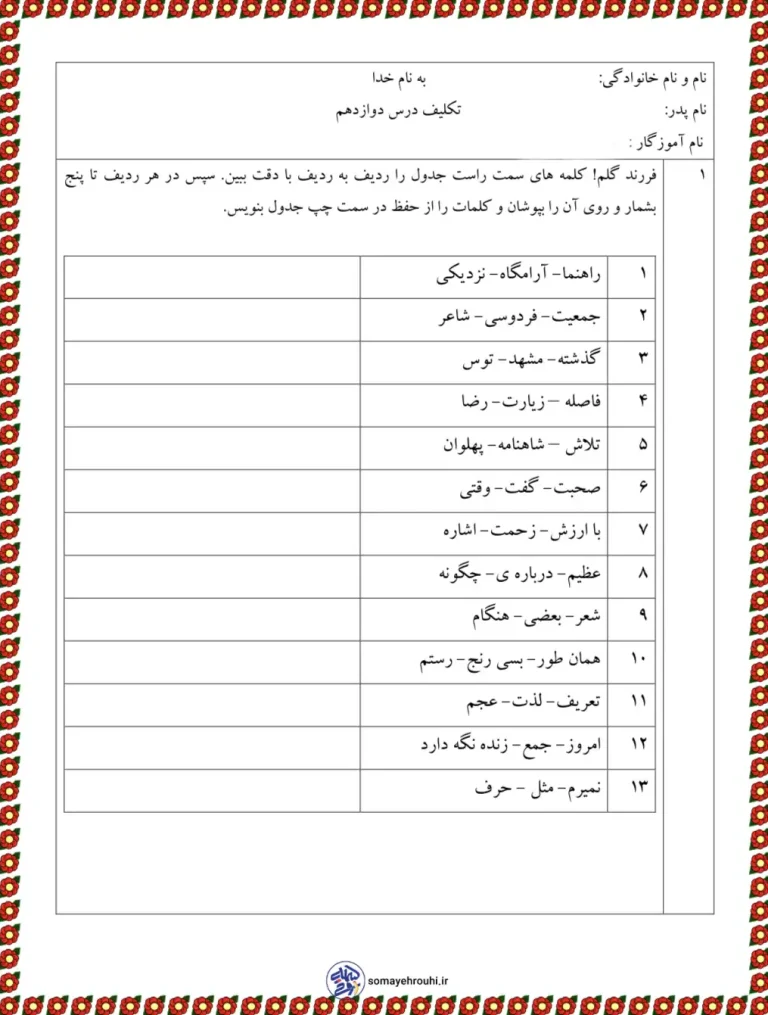2. تثبیت املای واژگان درس ۱۲: یادگیری کلمات کلیدی درس فردوسی (مثل: طوس، آرامگاه، شاهنامه، عجم، پهلوان).