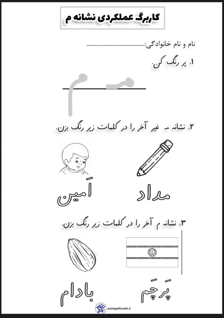 - مناسب برای ارزشیابی عملکردی: این کاربرگ به معلم یا والدین امکان میدهد تا میزان درک و عملکرد دانشآموز را در شناسایی و بهکارگیری نشانه “م” به آسانی ارزیابی کنند.