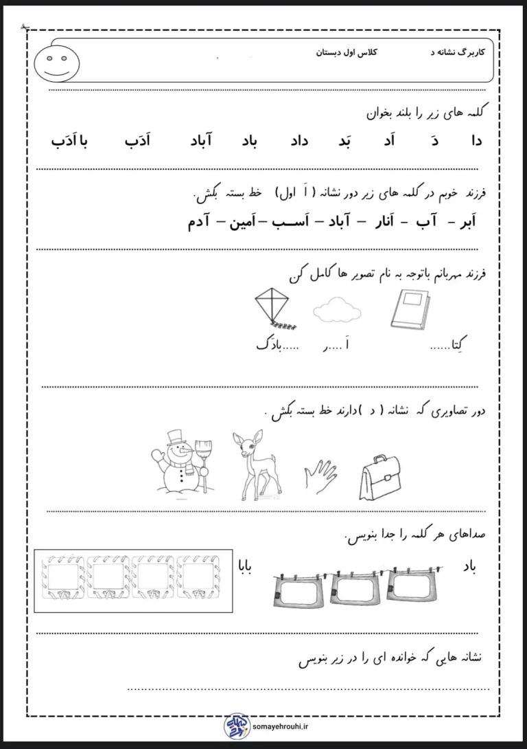 - این کاربرگ به طور اختصاصی برای کلاس اول دبستان و در ابتدای آموزش نشانه “د” در درسهای اول کتاب فارسی طراحی شده است.