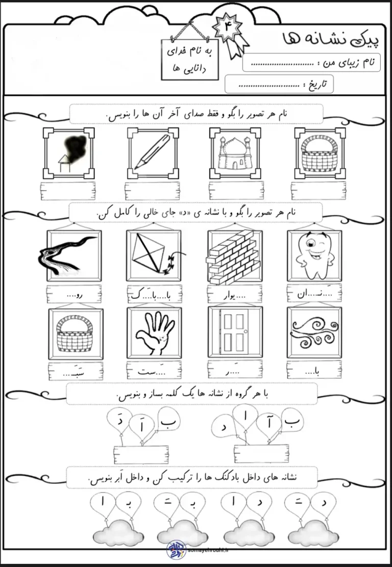 - تنوع در تمرینها: از تمرینهای دیداری-شنیداری (تشخیص صدای آخر کلمات)، ساخت ترکیب (بادکنکها و ابرهای کلمات) تا املای تصویری و نوشتن کلمات جدید (مانند آنچه در تصویر مشخص است)، تنوع کاملی را ارائه میدهد.