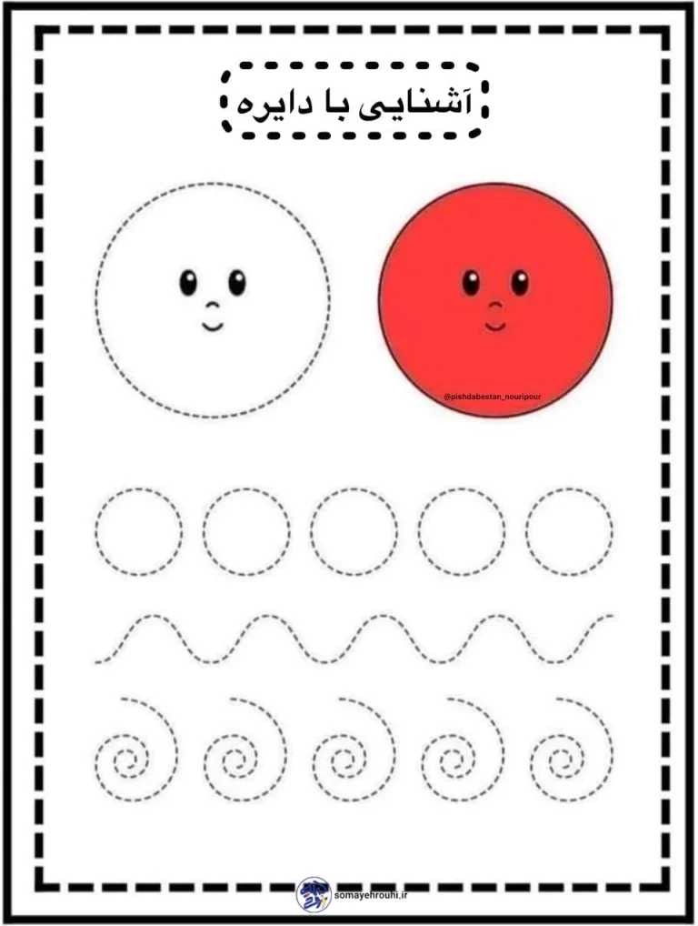 پیش از شروع کار، با نشان دادن اشیاء دایرهای واقعی (مانند ساعت، سکه یا توپ) مفهوم “دایره” را به کودک معرفی کنید. سپس از او بخواهید ابتدا با انگشت و بعد با مداد یا مدادرنگی، نقطهچینها را کامل کند.