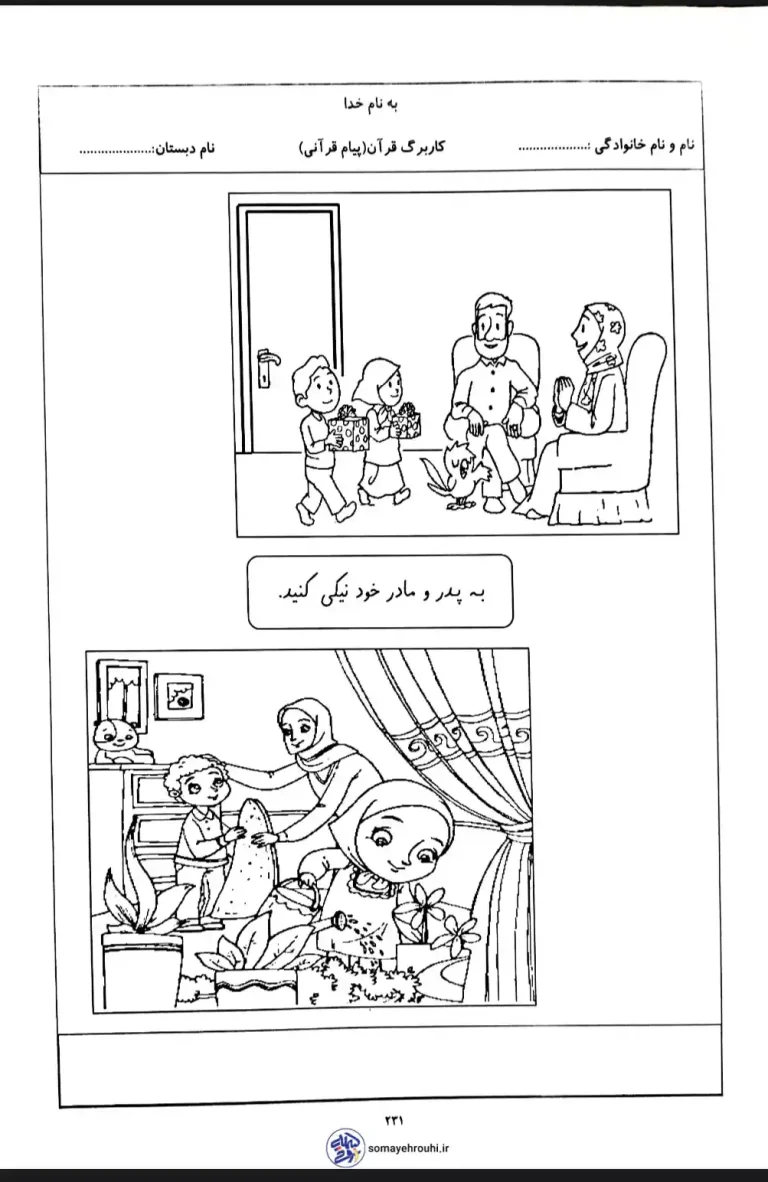 این کاربرگ پیام قرآنی اول ابتدایی بر اساس آیه شریفه “وَ بِالْوالِدَيْنِ إِحْسَاناً” (و به پدر و مادر نیکی کنید) طراحی شده است که در قرآن کریم بلافاصله پس از فرمان به توحید و یکتاپرستی آمده است. این همنشینی نشاندهندهی اهمیت فوقالعاده و جایگاه ویژه نیکی و احسان به والدین در نزد خداوند است. هدف این کاربرگ، انتقال این پیام حیاتی به کودکان با استفاده از تصاویر ملموس و قابل درک است تا دانشآموزان از همان سنین پایین، مصادیق عملی نیکی به والدین را در قالبهای رفتاری و گفتاری بیاموزند. نیکی به پدر و مادر، در واقع، ادای شکر نعمت وجود و تربیت است که پاداش دنیوی و اخروی فراوانی دارد.