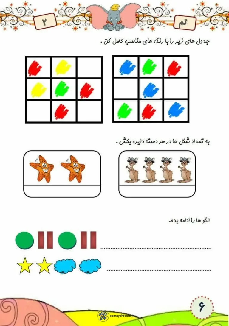 برگهی فعالیت حاضر، با طراحی رنگارنگ و استفاده از شخصیتهای کارتونی مانند دامبو و تصاویر جذاب دیگر (مانند ستارههای دریایی و کانگوروها)، محیطی جذاب و انگیزشی برای یادگیری فراهم میکند. تنوع تمرینها—از تکمیل جدول رنگی (مشابه سودوکو یا منطق ماتریسی ساده) تا شمارش اجسام و ادامهی الگوهای شکلی—باعث میشود که کودک خسته نشود و جنبههای مختلف هوش خود را به کار گیرد. هر بخش به سادگی و وضوح فرمولبندی شده تا کودک بتواند با حداقل نظارت والدین یا مربی، به فعالیت بپردازد.
