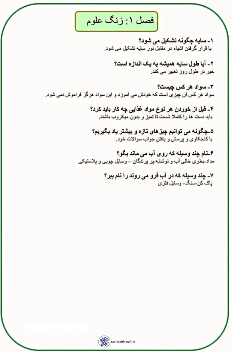 سوالات علوم فصل ۱ و ۲ پایه اول دبستان | با جواب