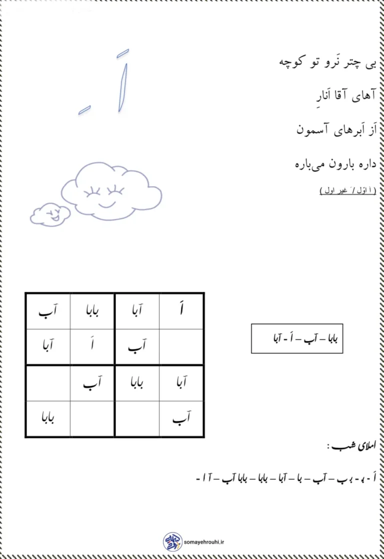 استفاده از شعر کودکانه و جذاب، تصاویر ساده و قابل فهم، تمرینهای هدفمند املا و تکرار اصولی نشانه (اَ) از ویژگیهای برجسته این کاربرگ است. طراحی مناسب برای سن دانشآموزان، هماهنگی با کتاب فارسی اول دبستان و امکان استفاده در کلاس درس یا منزل، این مجموعه را به ابزاری کاربردی برای معلمان و والدین تبدیل کرده است.