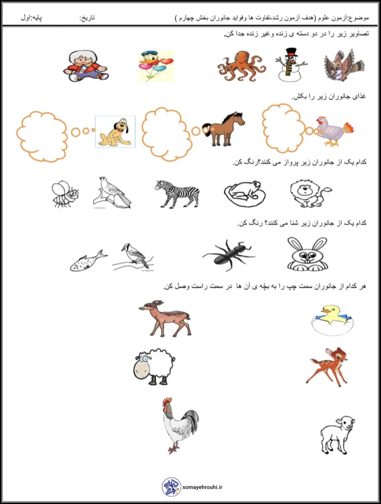 این کاربرگ علوم بخش چهارم پایه اول دبستان یک نمونه آزمون استاندارد و جذاب برای درس علوم پایه اول، مربوط به بخش (دنیای جانوران) است. در این فصل، دانشآموزان برای اولین بار به صورت علمی با مفاهیم پایهای زیستشناسی روبرو میشوند. هدف اصلی در این مرحله، برانگیختن حس کنجکاوی کودکان نسبت به محیط اطراف و موجودات زنده است. این برگه با استفاده از تصاویر کارتونی و دوستداشتنی، مفاهیم انتزاعی مثل “زنده و غیرزنده بودن”، “تغذیه”، “حرکت” و “تولید مثل” را به زبانی ساده و بصری تبدیل کرده است تا کودک بتواند بدون نیاز به خواندن متنهای طولانی، دانش خود را در مورد دنیای حیوانات محک بزند.