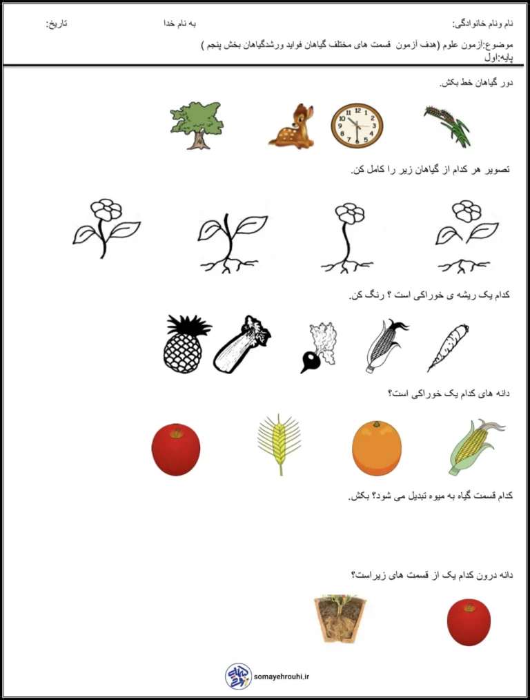 آشنایی با فواید گیاهان: شناخت بخشهای خوراکی گیاهان (ریشههای خوراکی، دانههای خوراکی و میوهها).