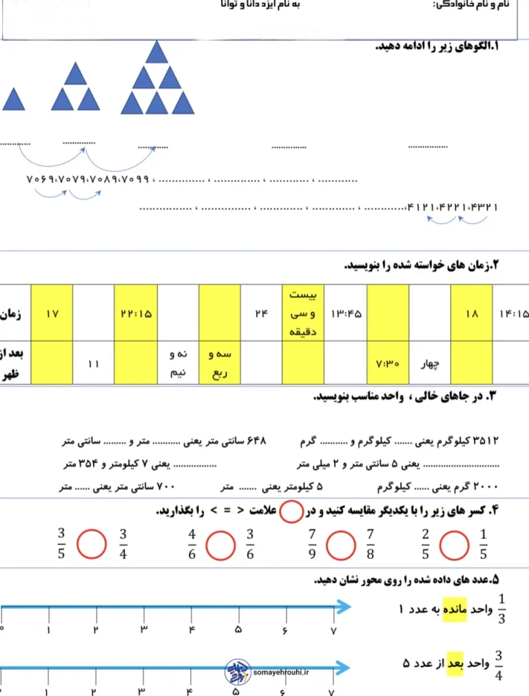 ۴. مفهوم کسر: مقایسه کسرها با صورت یا مخرج مساوی و نمایش آنها روی محور اعداد (سوال ۴ و ۵).