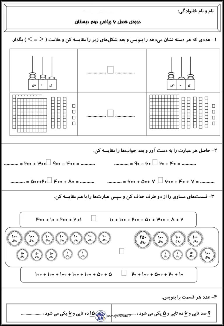این کاربرگ مربوط به **فصل ششم** ریاضی پایه دوم دبستان است که بر روی اعداد سه رقمی، جمع و تفریق آنها و مقایسه تمرکز دارد.