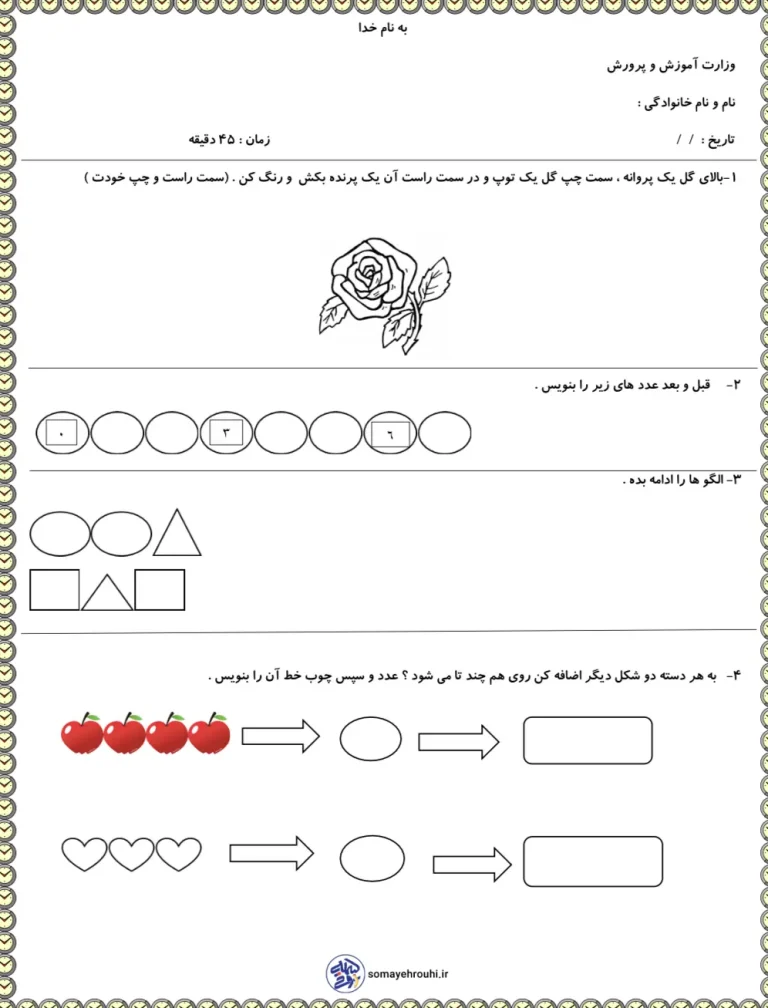 سوالات این مجموعه ترکیبی از فعالیتهای ترسیمی و محاسباتی است. برای مثال، در بخش الگوها، دانشآموز باید نظم موجود در شکلها را کشف و ادامه دهد.در بخش اعداد، مفاهیمی مانند “قبل و بعد” یک عدد و همچنین مقایسه دستهها (تشخیص دسته کمتر) مورد پرسش قرار میگیرد.این تنوع باعث میشود تمام سبکهای یادگیری (تصویری و نوشتاری) پوشش داده شده و نقاط قوت و ضعف کودک در دوازده تم نخست ریاضی به وضوح مشخص شود.