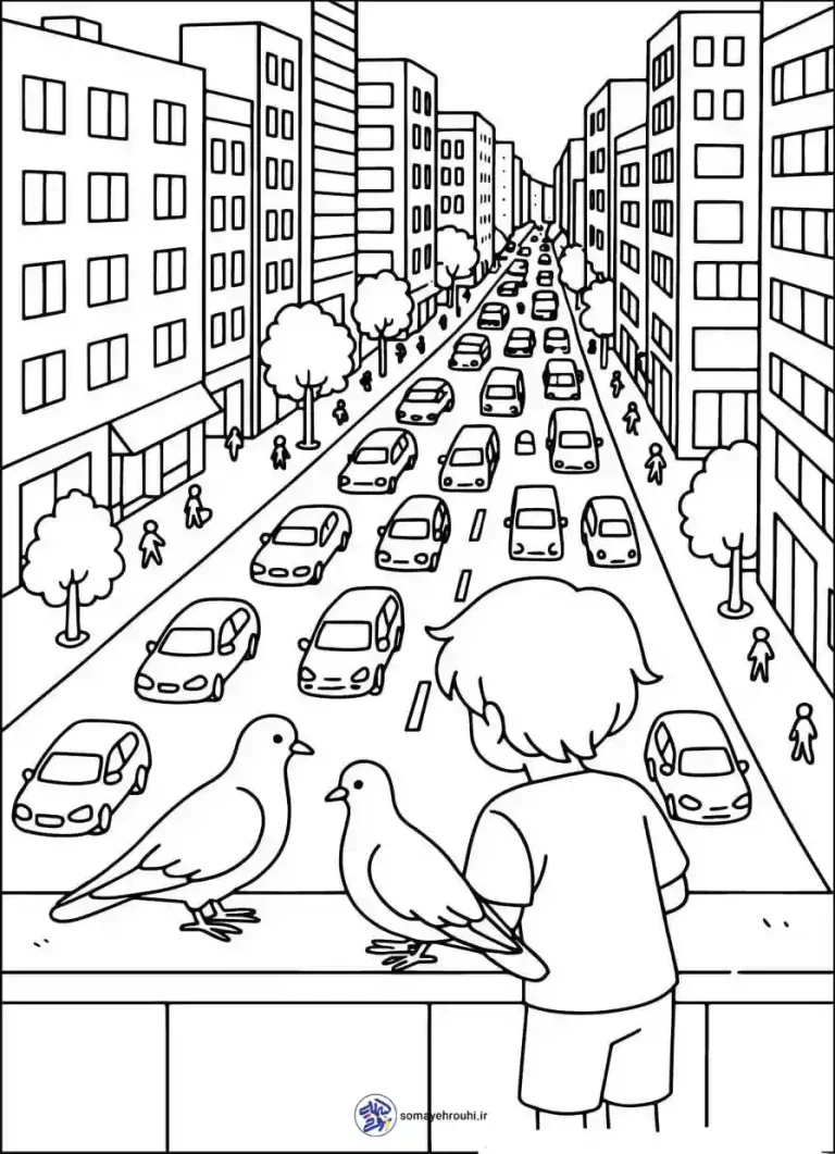 همچنین کودکی در تصویر قرار دارد که در کنار او دو کبوتر ایستاده اند و از بالای پل درحال تماشای خیابان است تصویر به گونهای طراحی شده که دانشآموز بتواند جزئیات محیط شهری را بهخوبی درک نماید و آن را به دلخواه رنگ آمیزی کند.