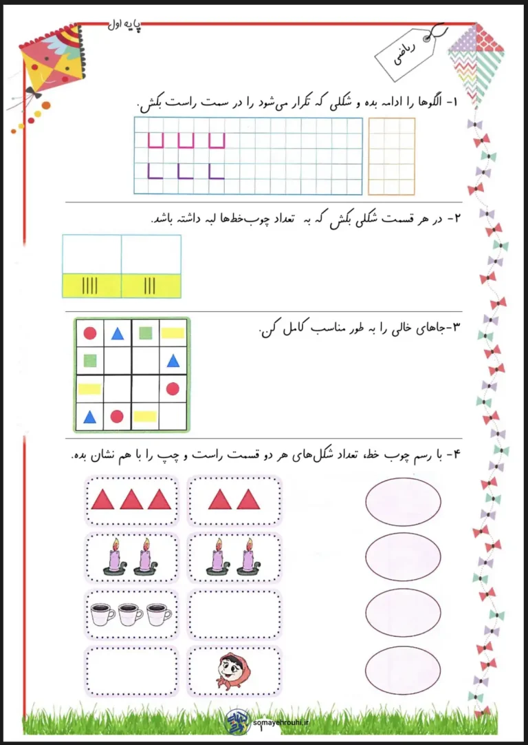 - ریاضی: تمرین درک مفهوم الگو، شناخت لبههای اشکال هندسی، و آشنایی با نشان دادن تعداد با چوبخط.