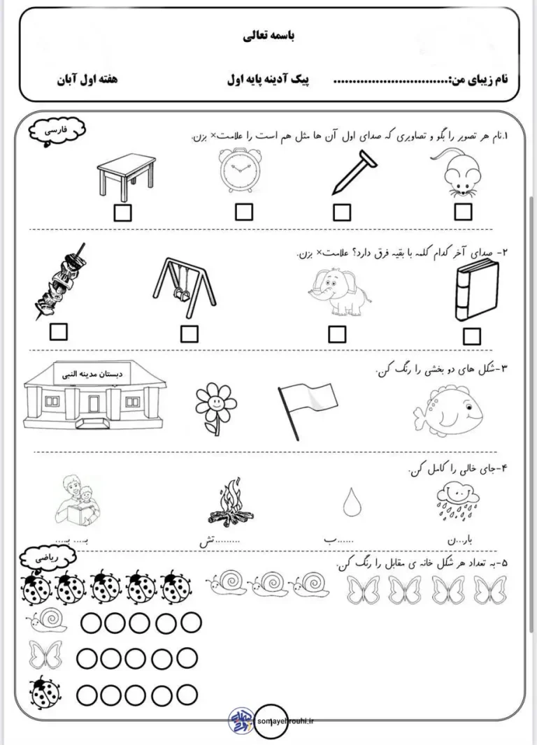 - تنوع در تمرین: شامل انواع سوالات مانند تطبیقی، چهارگزینهای، تکمیل کردنی، رنگآمیزی و شمارش.