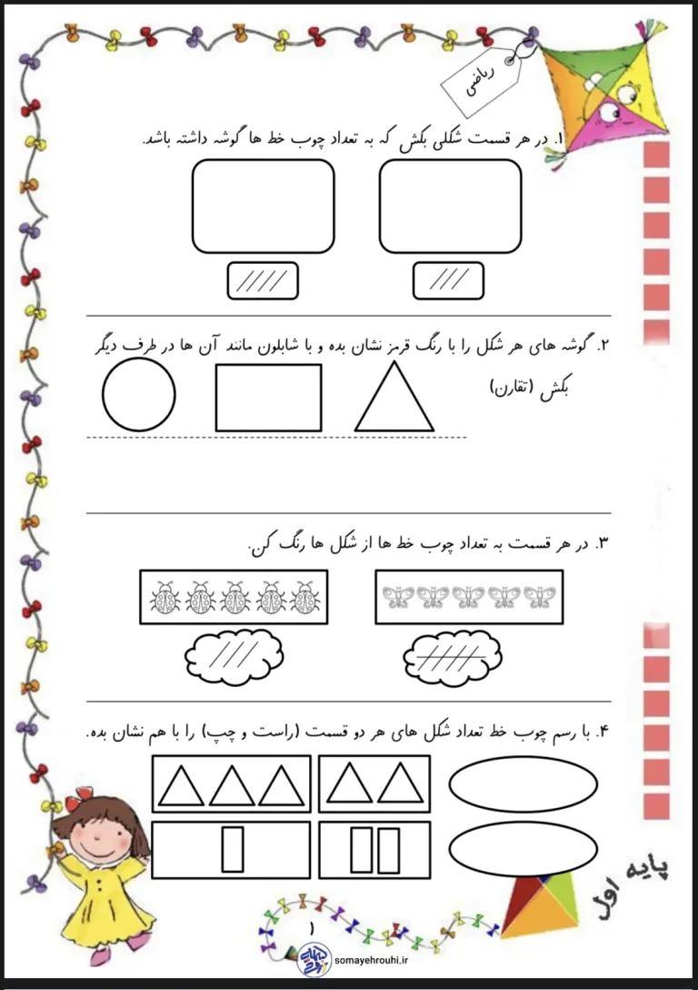 - هدف از بخشهایی مثل “تکمیل الگو” یا “تقارن” چیست؟ این تمرینها علاوه بر تثبیت مفاهیم ریاضی، به طور ویژه به تقویت تفکر خلاق، دقت دیداری و دستورزی کمک میکنند.