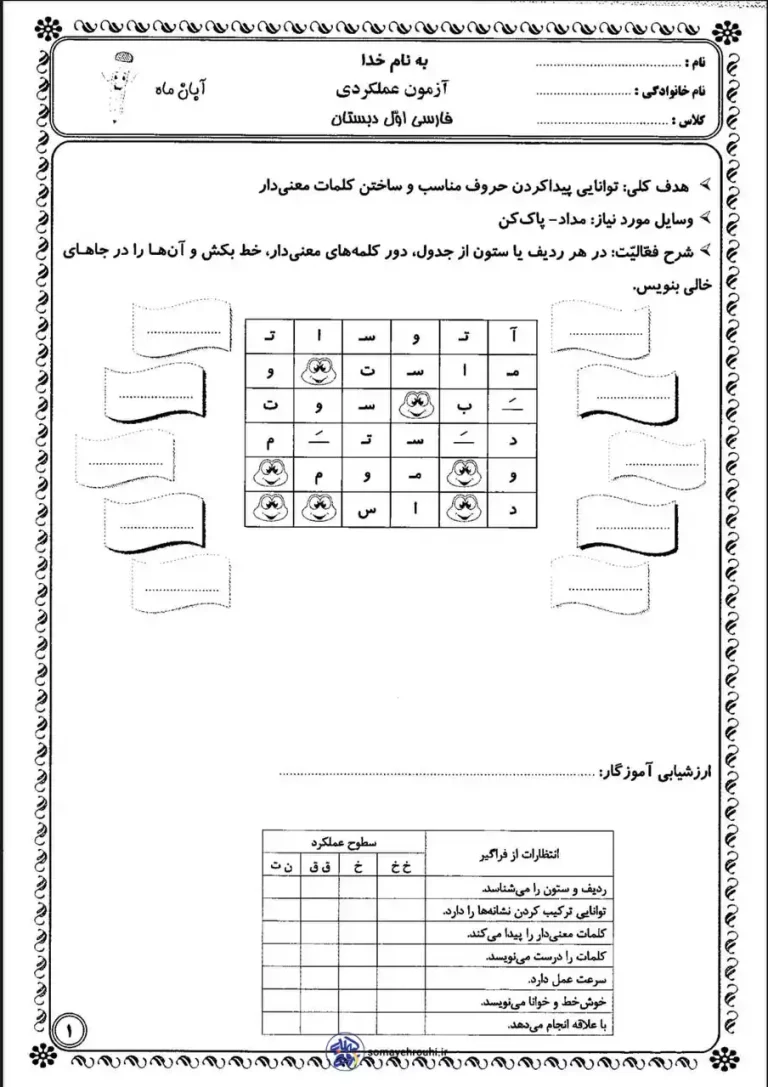 کاربرگ آزمون فارسی آبان ماه اول دبستان طوری طراحی شده که کودک بدون نیاز به راهنمایی زیاد، بهصورت کاوشمحور عمل کند و با پیدا کردن هر کلمه، احساس موفقیت و پیشرفت داشته باشد.