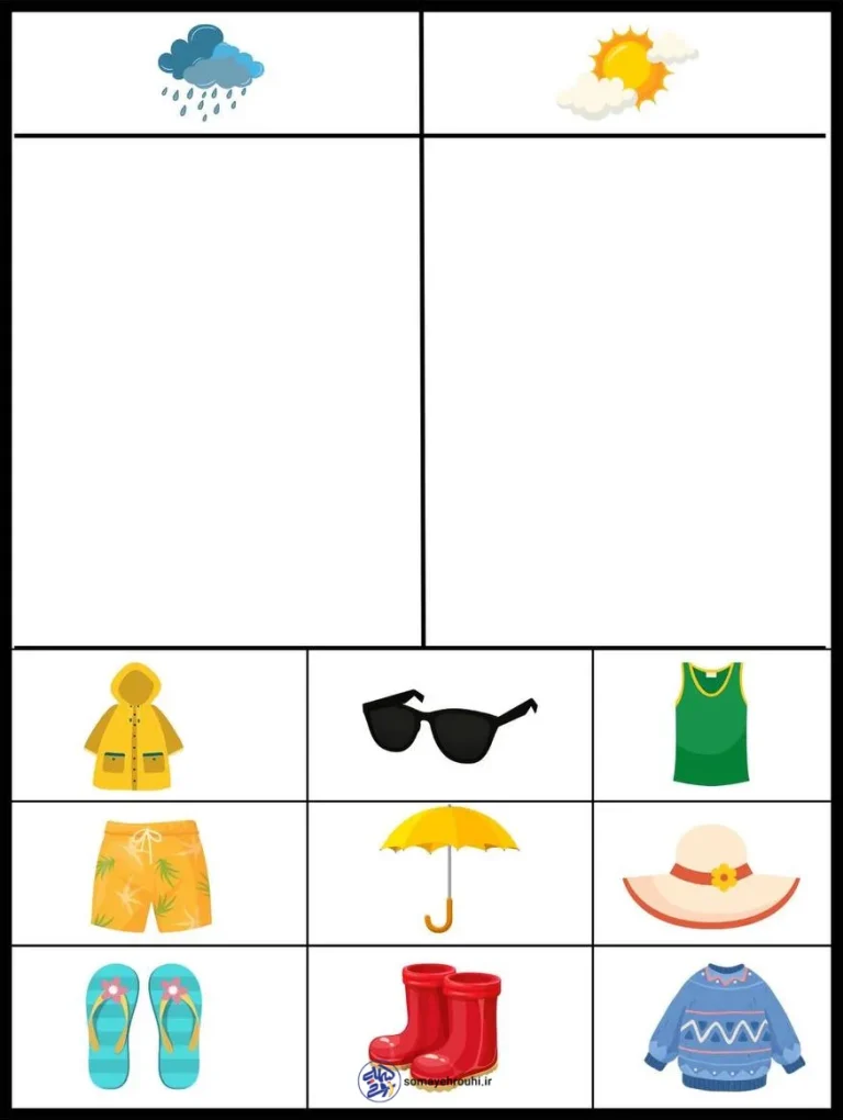 در بخش پایین کاربرگ، تصاویر مختلفی از لباسها و وسایل دیده میشود؛ مثل بارانی، چتر، چکمه، عینک آفتابی، کلاه، لباس تابستانی و لباس گرم. دانشآموز باید هر تصویر را بررسی کند و تصمیم بگیرد که آن وسیله برای هوای بارانی مناسب است یا برای هوای آفتابی و آن را در جای درست قرار دهد.